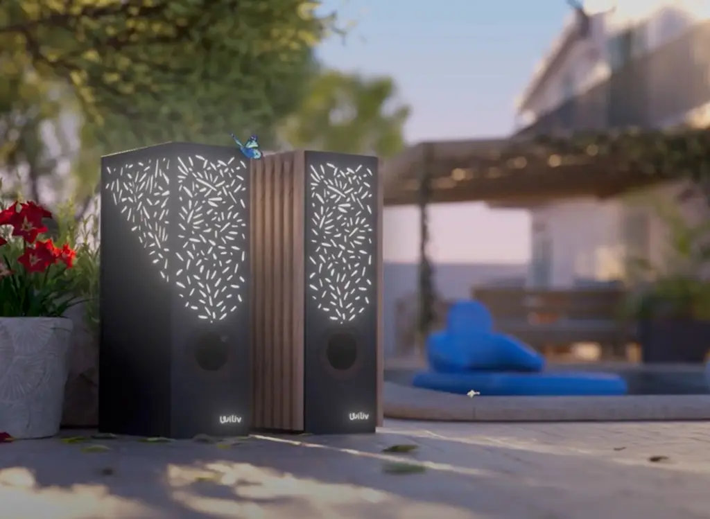 Son habillage imitation bois a été pensé pour s’intégrer facilement dans un environnement extérieur, sans jurer avec le mobilier ou la végétation. L’appareil est résistant aux intempéries et fonctionne même par forte chaleur ou en atmosphère humide. Sa lumière d’appoint créée une atmosphère chaleureuse et cosy.